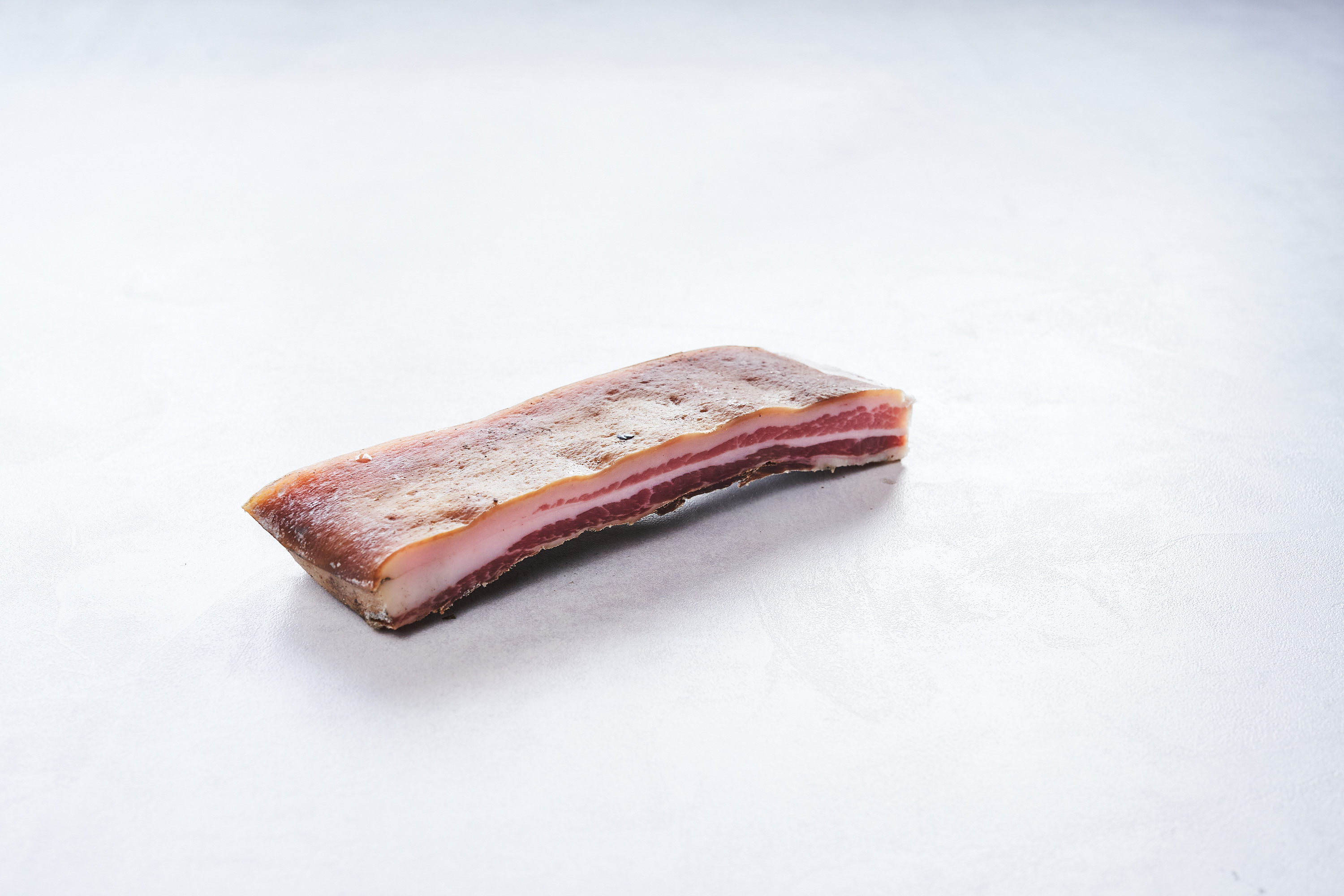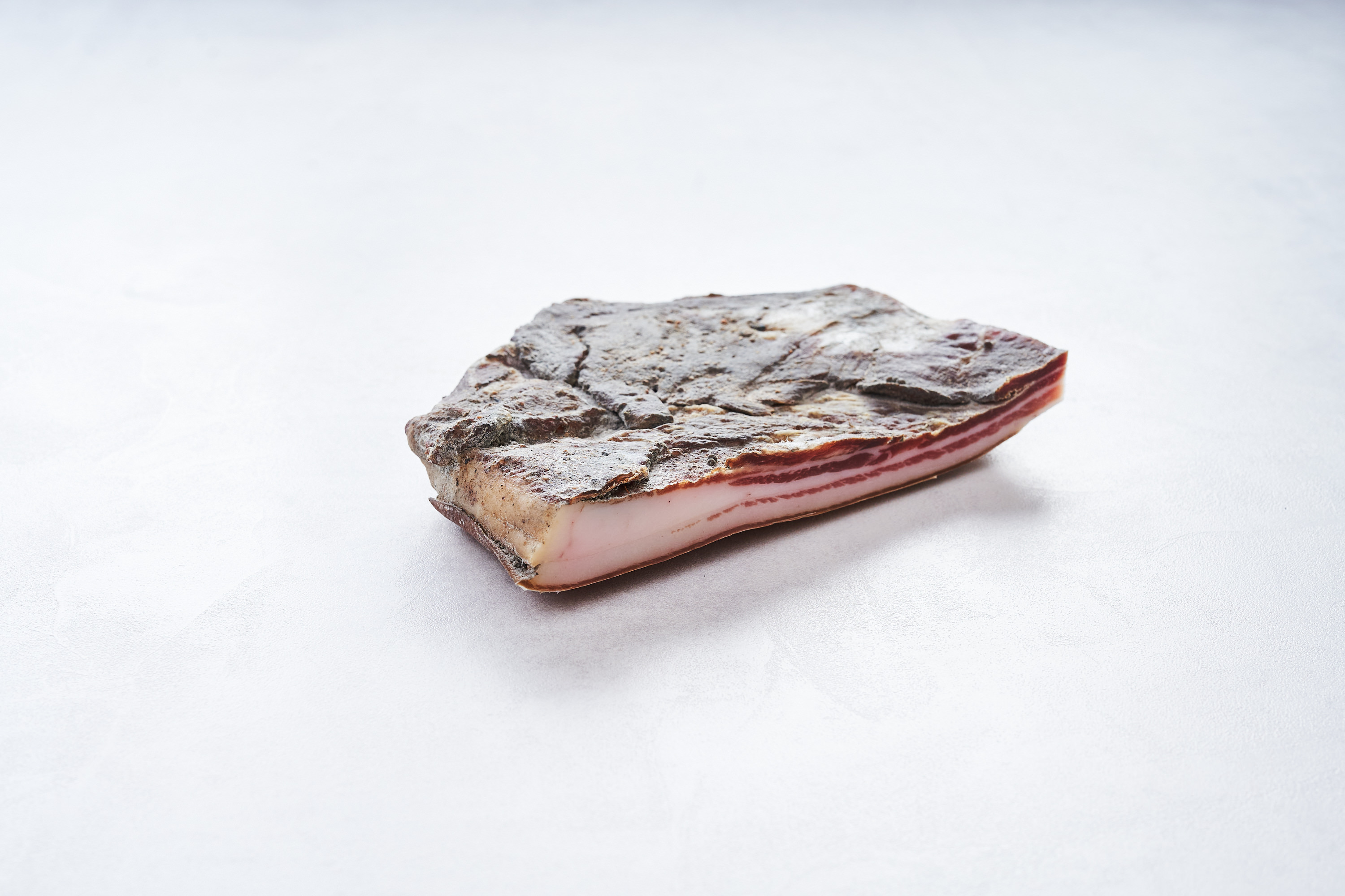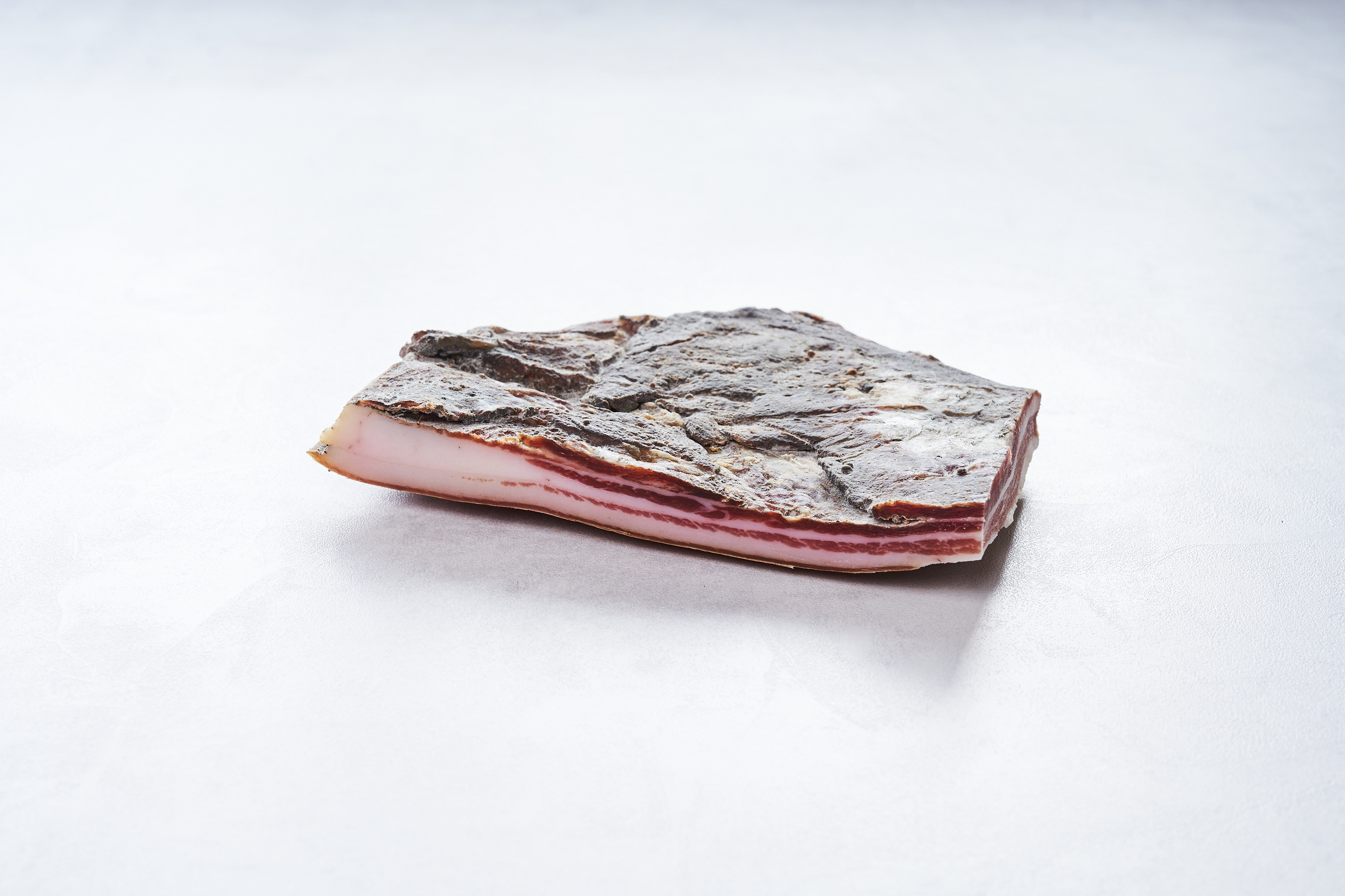 Genuine pancetta is a speciality that plays a particularly important role in Alpine cuisine. During production, the belly is first salted and then seasoned. It is then cold-smoked over beechwood for several weeks. To give it its very special, smoky flavour, the pancetta is then matured in beech ash.